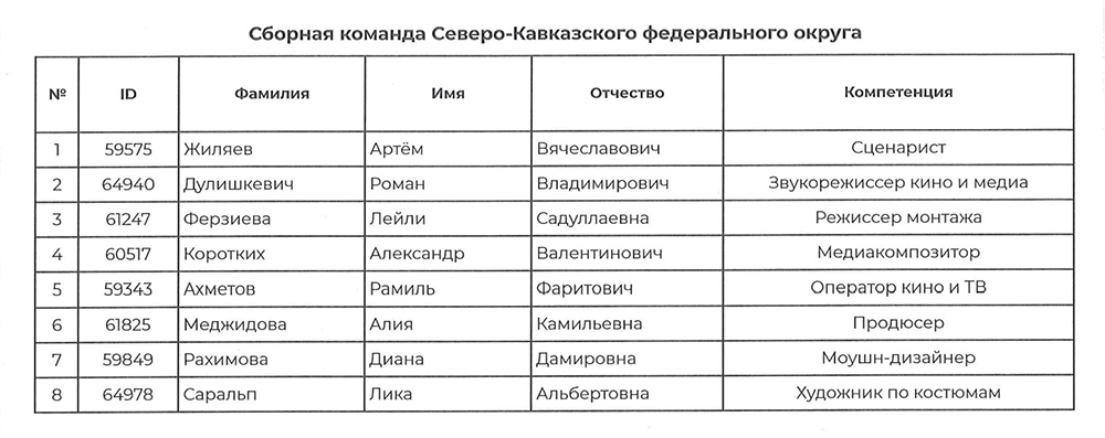 В команду также вошли и представители других республик, став участниками следующих компетенций: «Сценарист», «Оператор кино и ТВ», «Звукорежиссер кино и медиа», «Медиакомпозитор», «Моушн-дизайнер (CG-график)» и «Художник по костюмам».